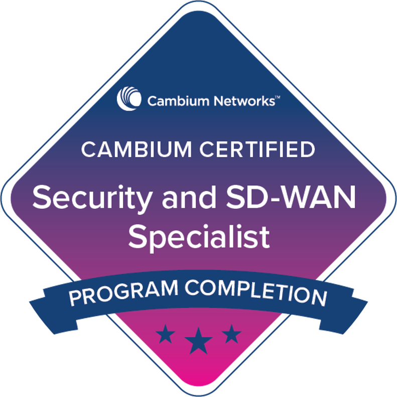 Al termine del corso, acquisirai la qualifica di Enterprise Technical Security and SD-WAN Specialist.  Si tratta di una delle 4 certificazioni specialistiche del percorso previsto per diventare Certified Enterprise Technical Associate Cambium Networks.