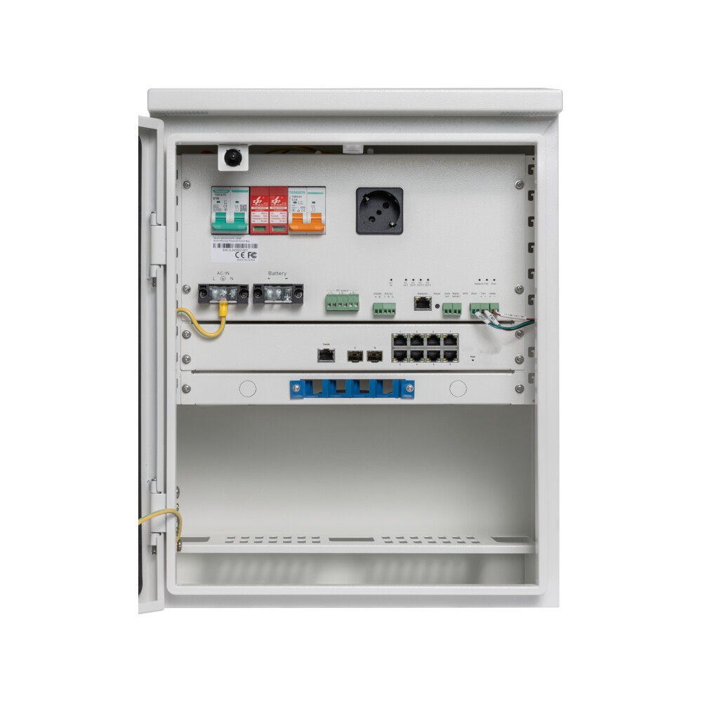 Dotata di uno switch Layer 2 con 8 porte PoE 10/100Base-TX e 2 porte SFP 10/100/1000Mbps, consente la connessione di dispositivi come telecamere e ponti radio. Il sistema include un cassetto ottico predisposto per 4 fibre ottiche, facilitando la gestione della connettività in fibra.